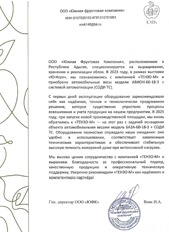 Выражаем искреннюю благодарность «Тензо-М» за ответственный подход и качественное выполнение работ по монтажу и обслуживанию автомобильных весов ВПП-40 «Фермер» 2 шт., ВА-40-12